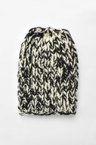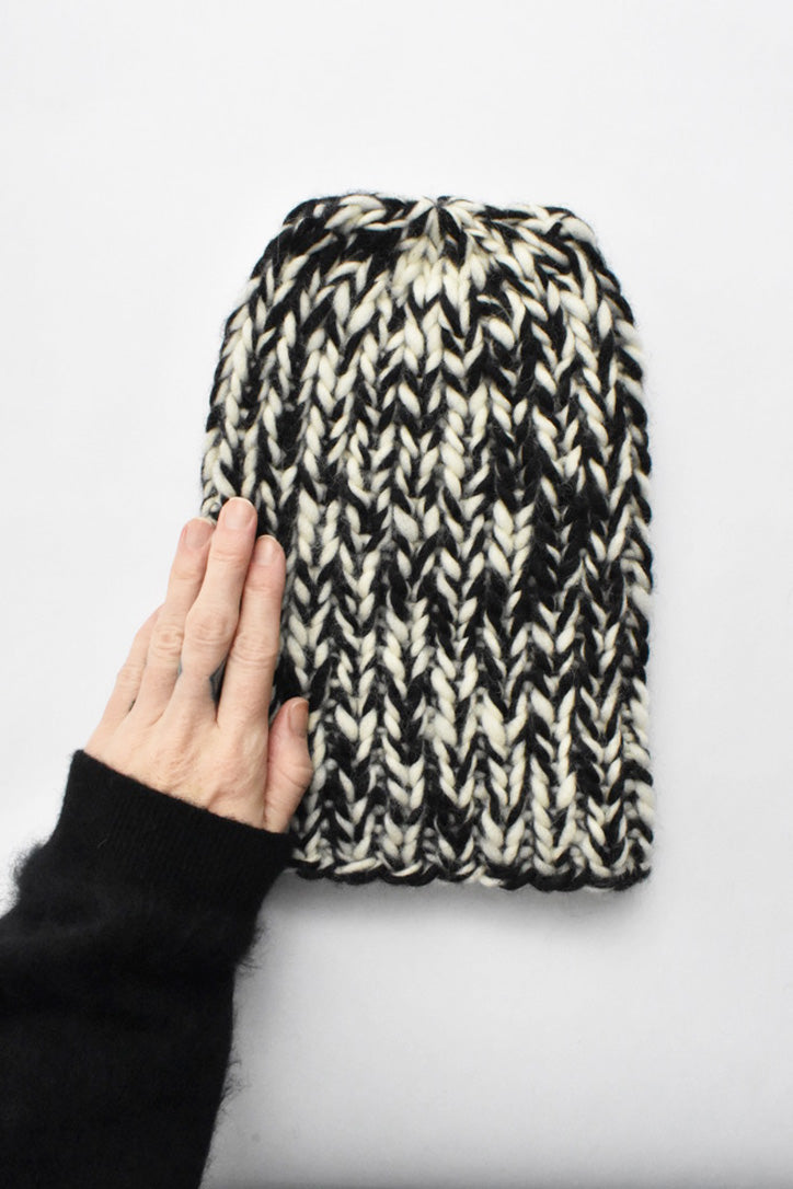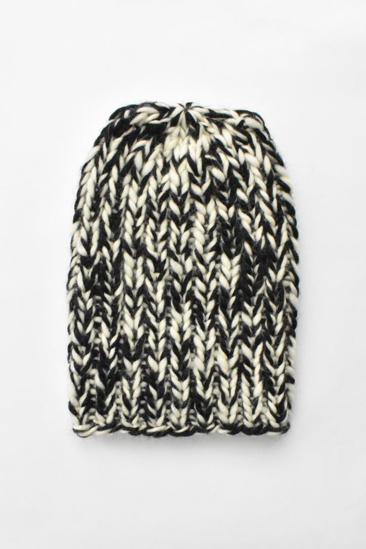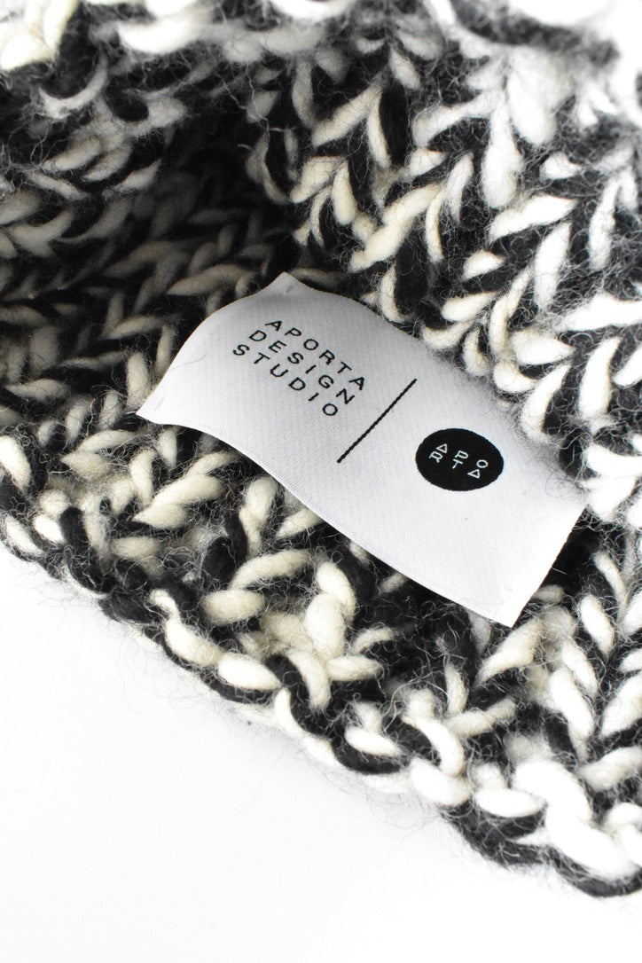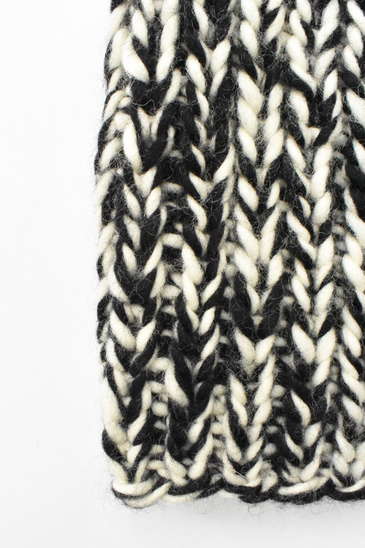 A one-of-a-kind piece, hand-knit in Missoula, Montana. Knit from a bulky blend of soft black and white wool, it embodies both versatility and refined comfort in equal measure.