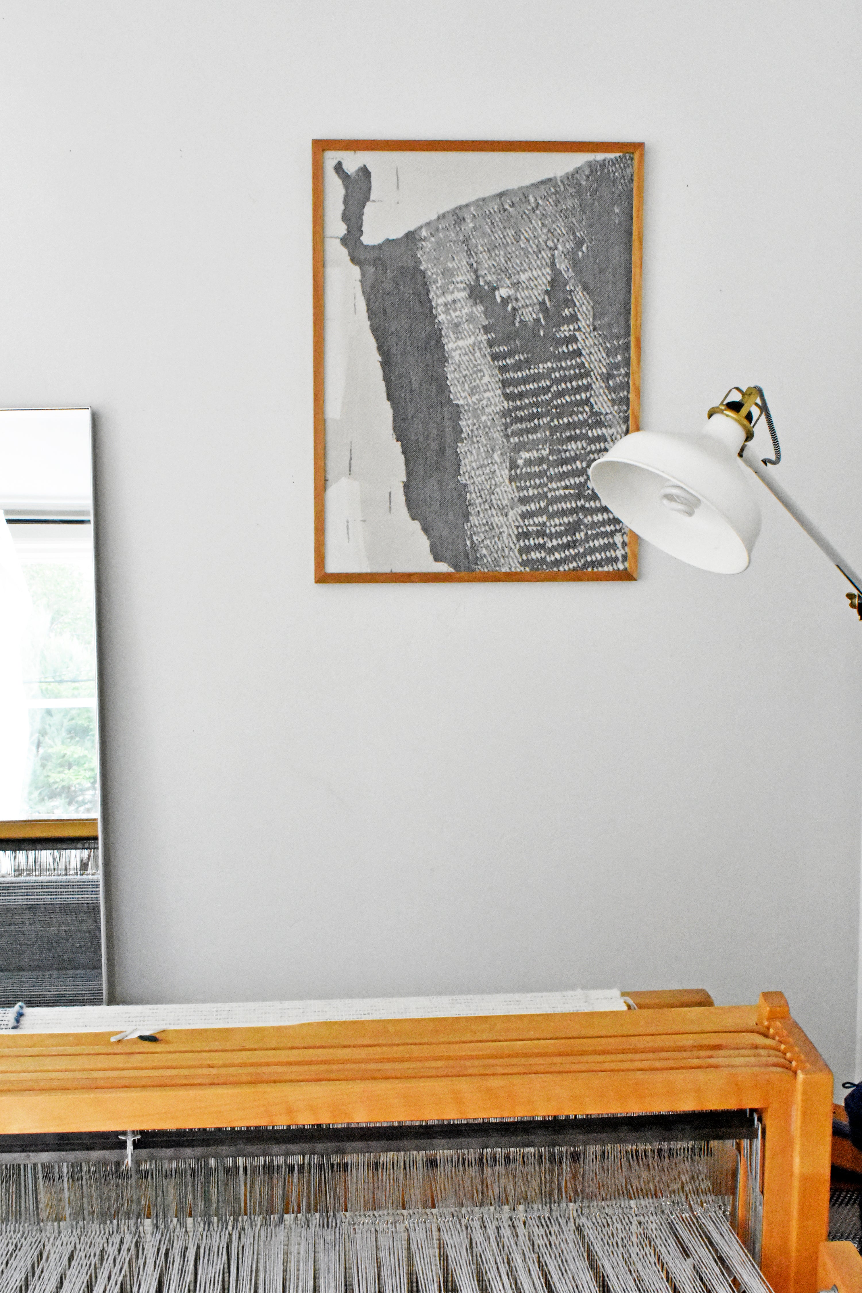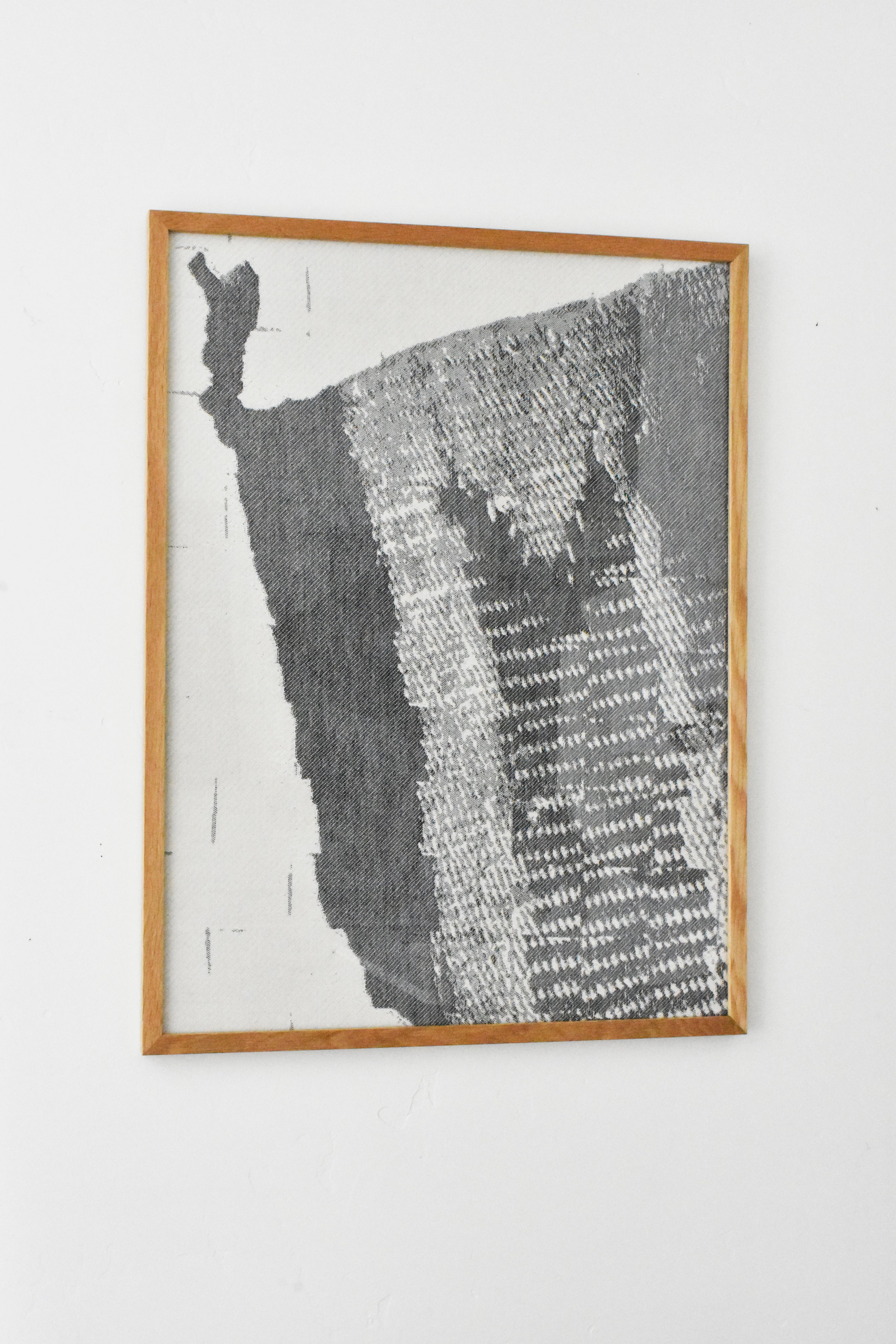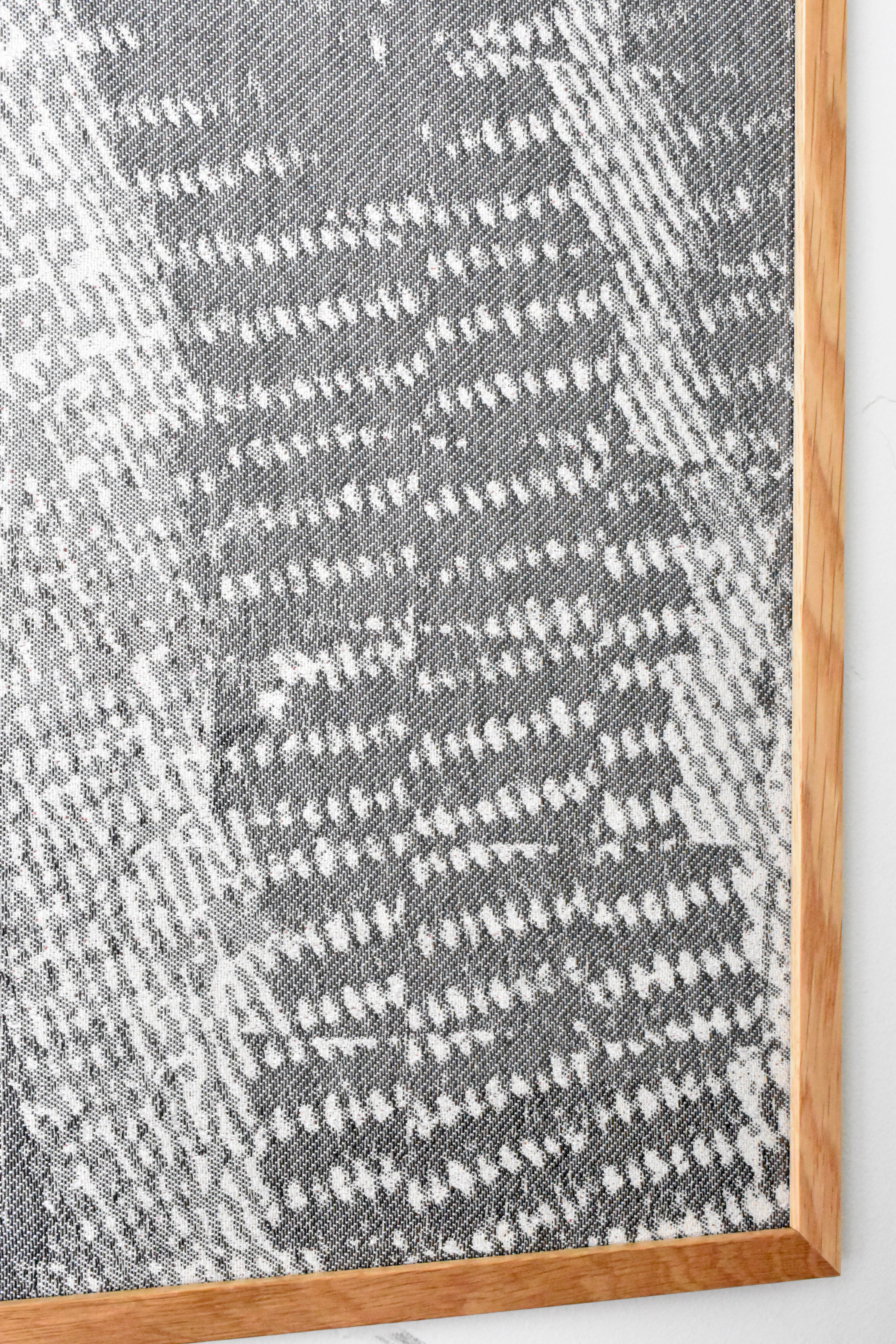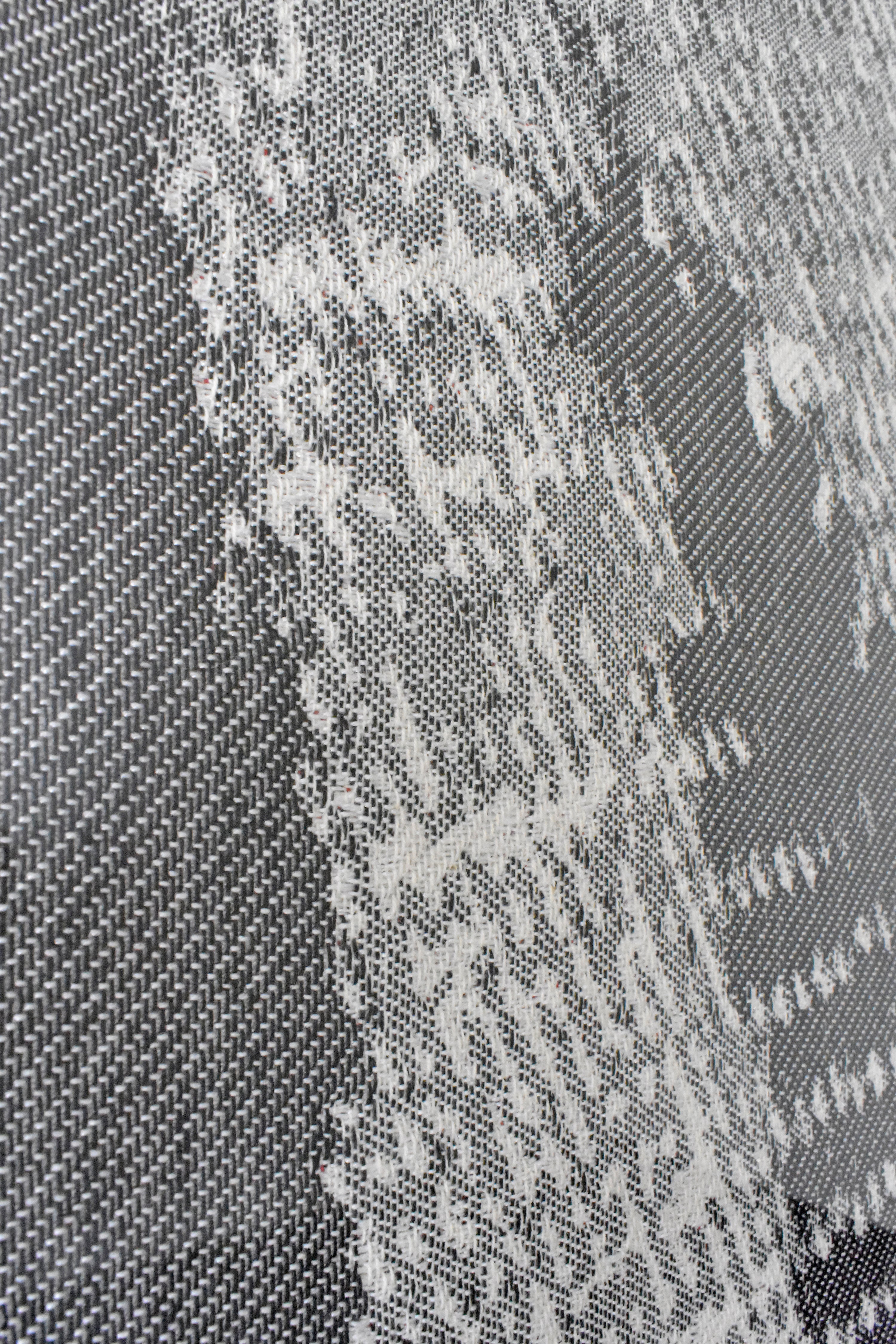 "Pathway #1" by artist Noelle Sharp. Part of a large study of layered art mediums, this is a digital jacquard weaving based off a digital ink jet print of "Raised Outline" hand woven weaving. The artist cut the digital ink jet print into strips, then rewove the strips into a new piece which she photographed and wove digitally.
