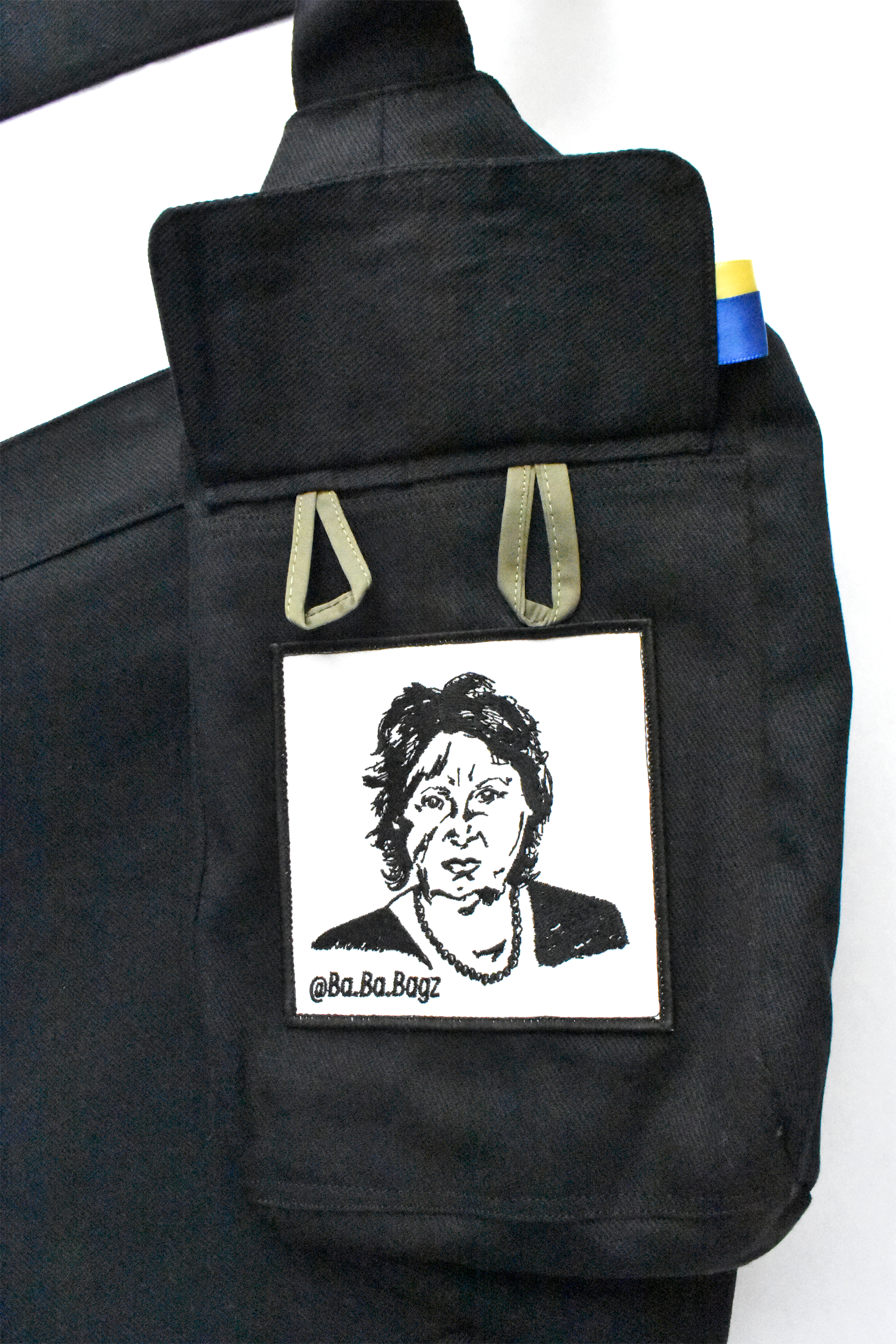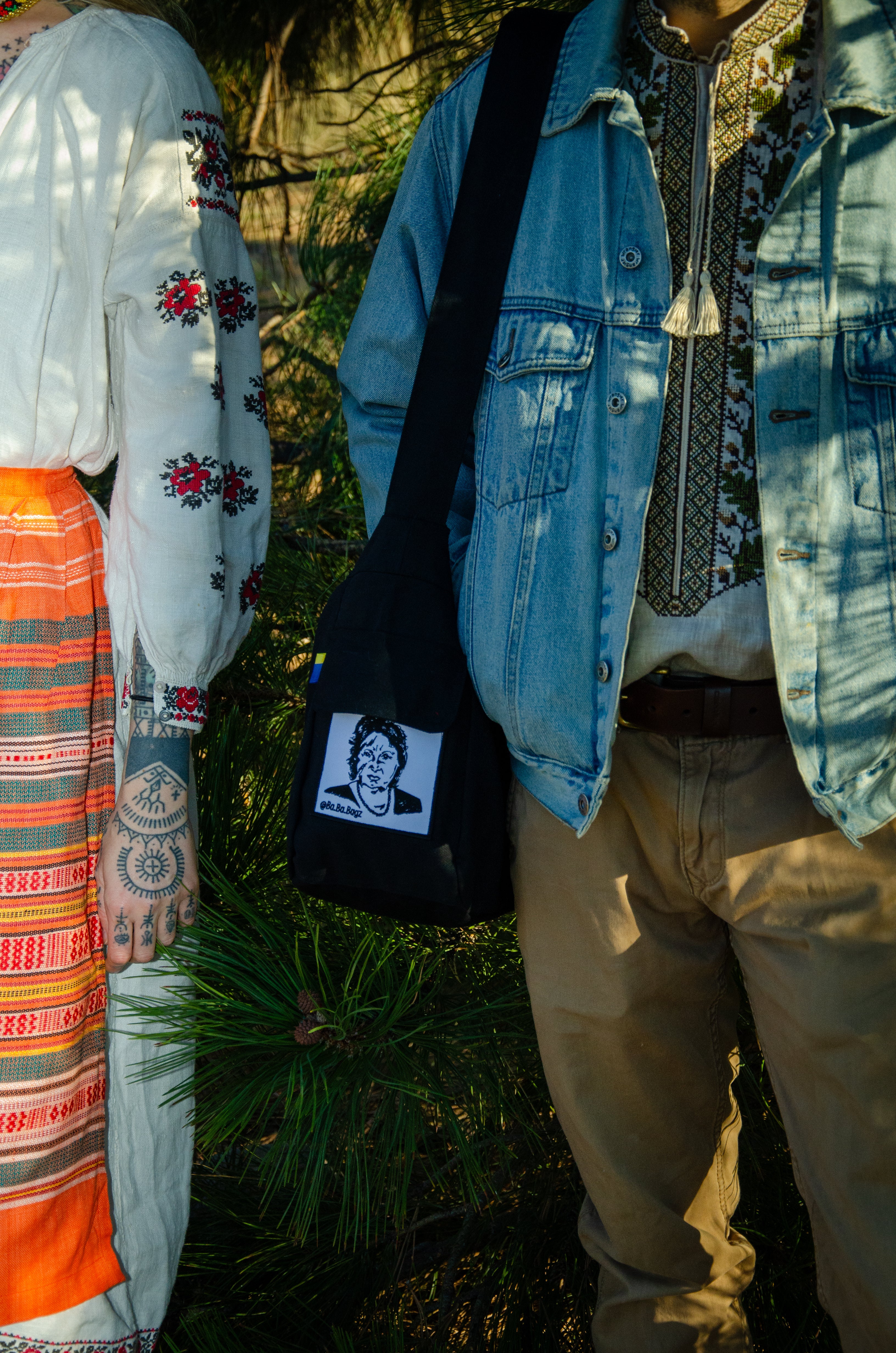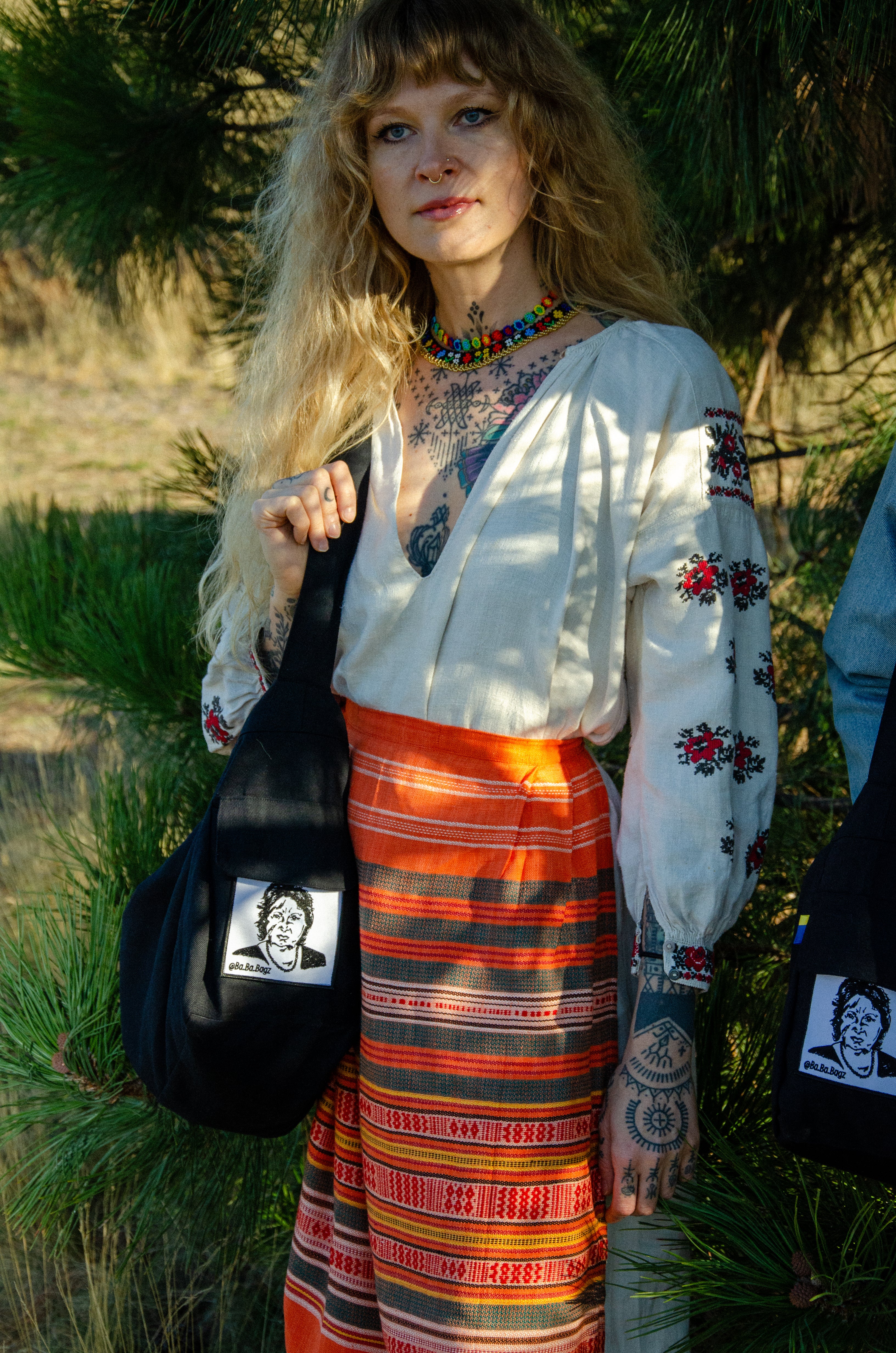 "Bigger is maybe better? Fit more stuff, extra pockets, loops to hang your keys, comfy, and most importantly... impeccable style! hand sewn by Babushka one by one, designed by Sasha. 50% of sales go to a family member fighting on the front lines of Ukraine." - Vera and Sasha