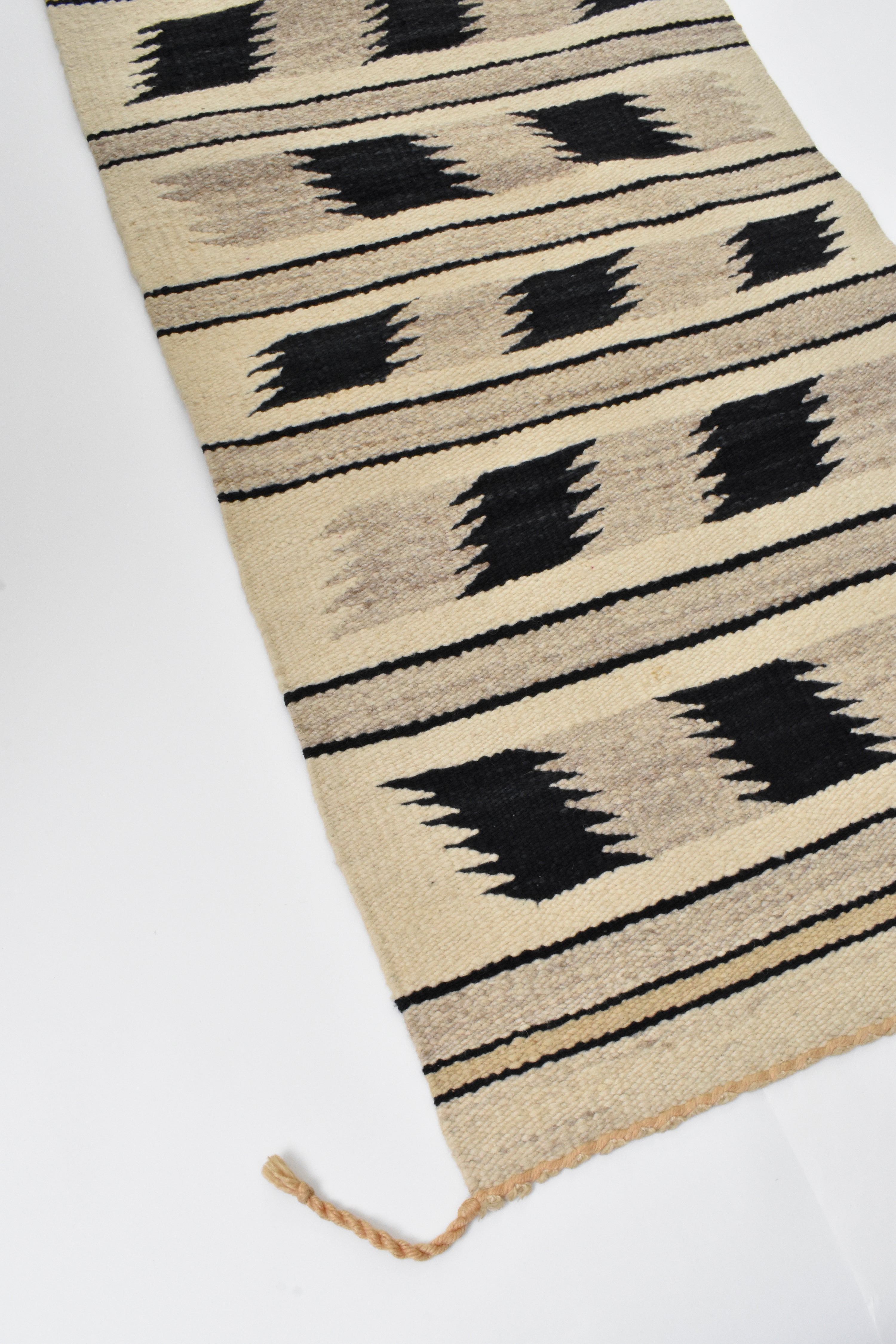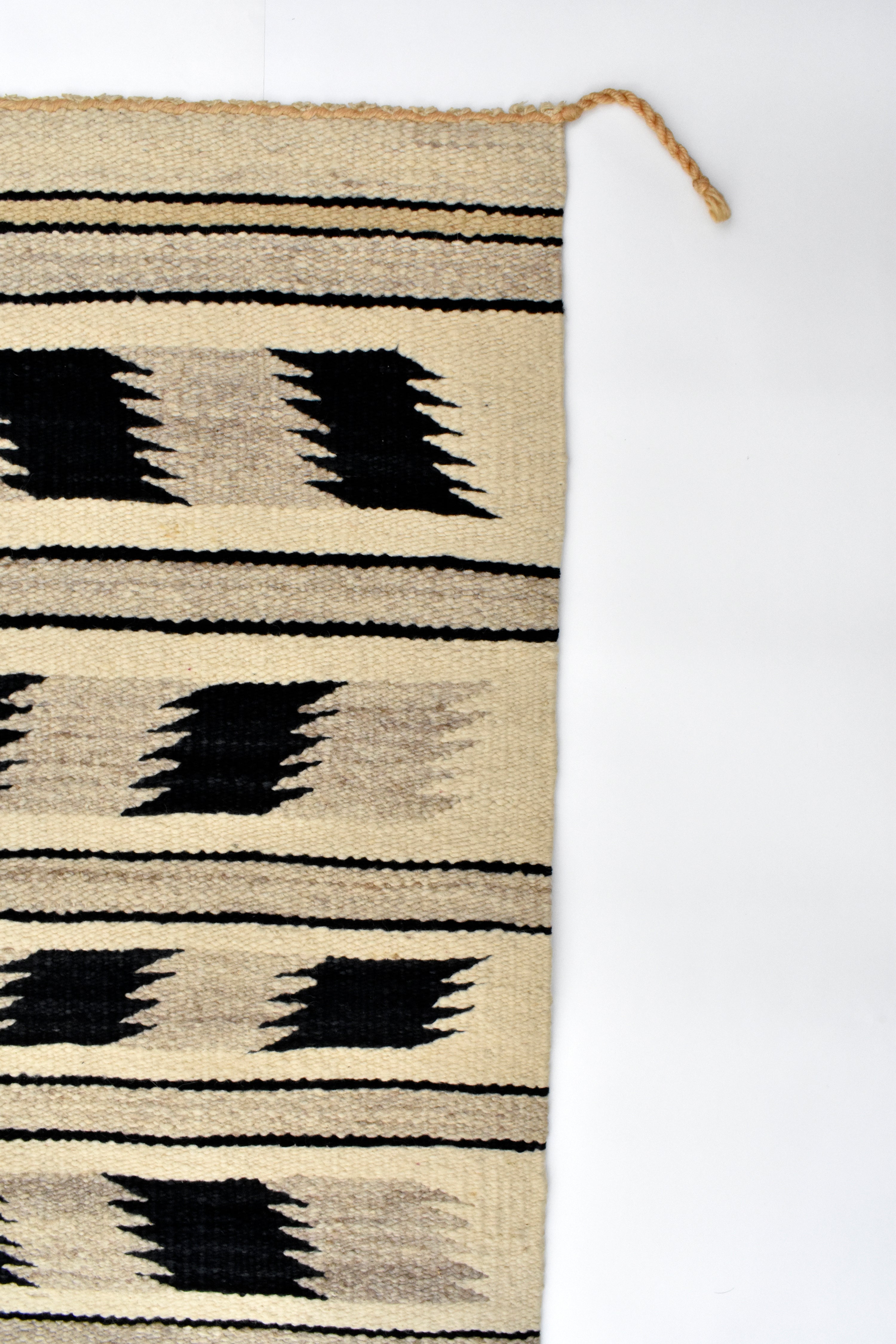 Expertly woven and perfectly preserved Navajo "Wind" design rug. From the 1930's possibly 1940's, hand woven Churro wool. Excellent if not perfect condition, as if it was woven yesterday. Modern day Navajo rugs are often woven from commercially produced yarn, it is a rare and lucky thing to have one woven from hand woven wool. We like to drape our Navajo rugs over our couch, an ottoman, chair or you can always hang on a wall to display as art. One of a kind, truly an heirloom piece.